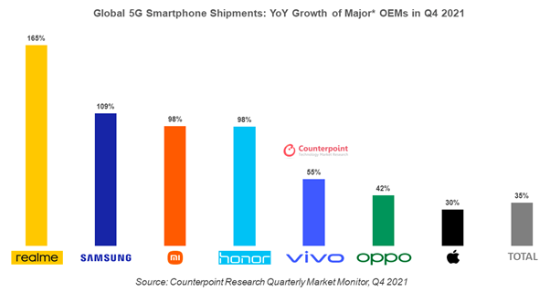 Σύμφωνα με την τελευταία έκθεση Counterpoint Research, η ανάπτυξη των αποστολών 5G της realme ξεπέρασε αριθμητικά όλες τις μεγάλες μάρκες smartphone με τεράστια αύξηση της τάξης του 165% σε ετήσια βάση, το τέταρτο τρίμηνο του 2021. Η ταχεία ανάπτυξη τροφοδοτήθηκε από την επέκταση της εταιρείας σε χώρες της Δυτικής Ευρώπης όπως η Ιταλία, η Ισπανία, η Γαλλία, το Ηνωμένο Βασίλειο και η Ελβετία, σε καθεμία από τις οποίες είναι η ταχύτερα αναπτυσσόμενη μάρκα χάρη στη σειρά GT και το 8 5G.