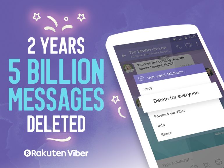 Το Viber, μία από τις κορυφαίες εφαρμογές ανταλλαγής μηνυμάτων στον κόσμο, γιορτάζει τα δύο χρόνια λειτουργίας της υπηρεσίας «Διαγραφή μηνύματος», που λανσαρίστηκε επίσημα το Νοέμβριο του 2015. Σήμερα, το Viber ανακοινώνει ότι οι χρήστες της εφαρμογής έχουν διαγράψει συνολικά πέντε δισεκατομμύρια μηνύματα έως τώρα.