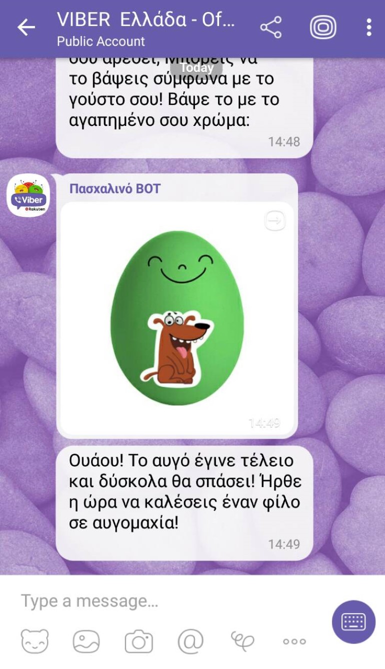 Μετά την πολύ μεγάλη επιτυχία του bot της Viber που σχεδιάστηκε ειδικά για την ημέρα του Αγίου Βαλεντίνου, η Viber προσφέρει το νέο μοναδικό bot της Αυγομαχίας, βάζοντας ακόμα πιο ψηλά τον πήχη στην ψηφιακή διάσταση των πασχαλινών διακοπών. Και πως θα μάθεις αν είσαι ο απόλυτος αυγοπρωταθλητής αυτό το Πάσχα;
