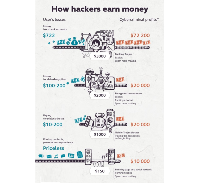 Χωρίς καμία αμφιβολία, η συνεχόμενη «μάστιγα» στο τοπίο των υπολογιστών πάσας μορφής είναι το κακόβουλο λογισμικό και οι επιθέσεις στα συστήματα με ποικίλους τρόπους. Οι hacker ή αλλιώς εγκληματίες του κυβερνοχώρου (cyberspace / cybercriminals), αποτελούν τον Νο 1 κίνδυνο για κάθε υπολογιστή, είτε πρόκειται ενός απλού χρήστη, είτε για μιας εταιρείας, αποκομίζοντας μεγάλα κέρδη. Πόσα όμως είναι αυτά; Τα κέρδη λοιπόν, των ψηφιακών εγκληματιών, μπορούν να είναι έως και είκοσι φορές μεγαλύτερα σε σχέση με το κόστος των επιθέσεων τους. Στο πλαίσιο έρευνας που υλοποίησαν οι ειδικοί της εταιρείας Kaspersky, προχώρησαν στη σύγκριση μεταξύ του κόστους των εργαλείων που χρησιμοποιούν πιο συχνά οι χάκερ, σε σχέση με τα χρήματα που αποσπούν μέσα από μια επιτυχημένη κακόβουλη επιχείρηση.