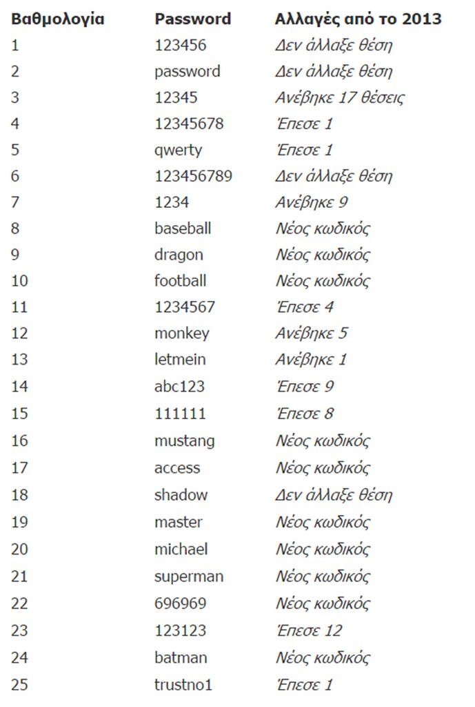 Η εταιρεία ασφαλείας Splash Data μόλις έδωσε στη δημοσιότητα τον ετήσιο κατάλογο με τους πιο δημοφιλείς κωδικούς πρόσβασης. Τα passwords είχαν κλαπεί κατά τη διάρκεια του έτους που μας πέρασε και παρά τις προσπάθειες των ειδικών ασφαλείας, και των κυβερνήσεων να μας προστατεύσουν, προφανώς κανείς δεν δείχνει να έχει βάλει μυαλό.