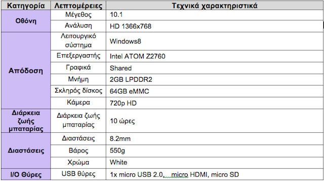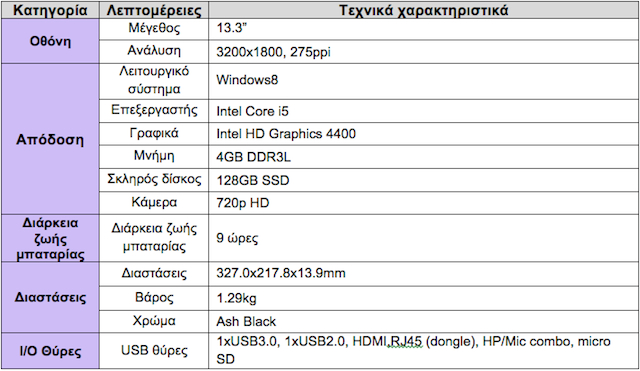 Τεχνικά χαρακτηριστικά Samsung ATIV Tab 3
