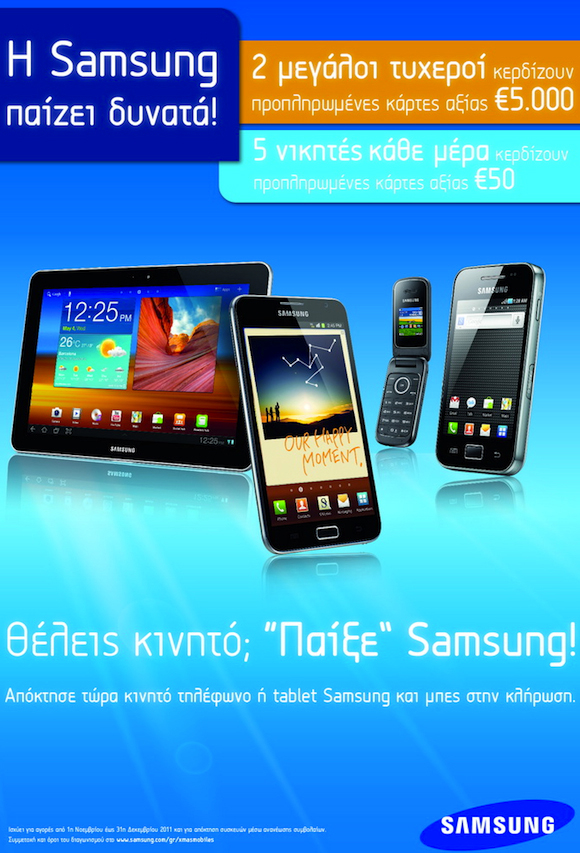 Η Samsung Electronics Hellas σας προσκαλεί να συμμετάσχετε στον μεγάλο διαγωνισμό με τίτλο «Θέλεις κινητό; Παίξε Samsung!». Καθημερινά, πέντε νικητές κερδίζουν προπληρωμένες κάρτες χρηματικής αξίας 50 ευρώ, ενώ στην πρωτοχρονιάτικη κλήρωση θα αναδειχθούν δύο μεγάλοι τυχεροί που θα κερδίσουν προπληρωμένες κάρτες χρηματικής αξίας 5.000 ευρώ. Η συμμετοχή στον διαγωνισμό προϋποθέτει αγορά συσκευών κινητής τηλεφωνίας ή ταμπλετών Samsung.