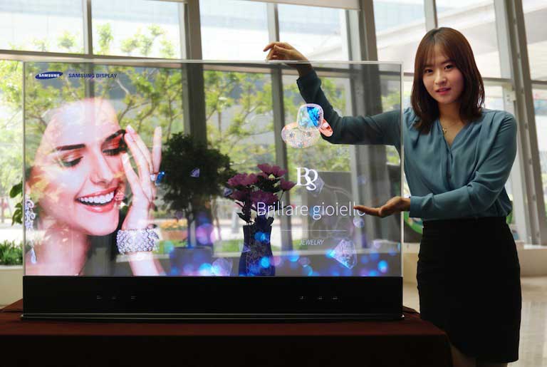 Η Samsung αποκάλυψε στο Χονγκ Κονγκ νέες οθόνες οι οποίες εκπλήσσουν με την τεχνολογία που φέρουν, λόγω του ότι είναι κάποια μοντέλα είναι διάφανα ενώ άλλα λειτουργούν και ως καθρέφτες. Παρόλο που η εταιρεία παρουσίασε αρχικά τις οθόνες για χρήση ως μέσο προβολής διαφημίσεων, μελλοντικά στοχεύει να χρησιμοποιηθούν και ως «εικονικά δοκιμαστήρια». Με αυτόν τον όρο, η Samsung εννοεί ότι θα μπορεί ο πελάτης ενός καταστήματος ένδυσης και υπόδησης, να «φορέσει» σε ψηφιακή μορφή τις επιλογές του και να δει εαυτόν στην διάφανη-καθρέφτη οθόνη το τελικό αποτέλεσμα.