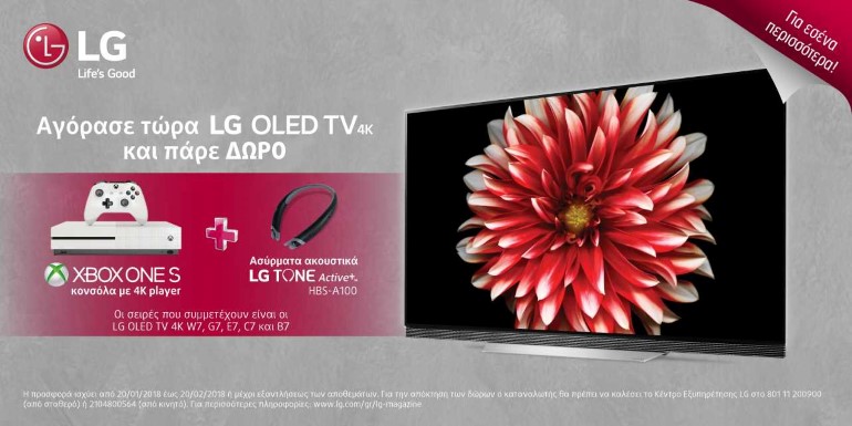 Από το Σάββατο 20 Ιανουαρίου και για ένα μήνα (μέχρι τις 20 Φεβρουαρίου), οι καταναλωτές που επιλέγουν μία LG OLED TV 4Κ της LG Electronics (LG) επιβραβεύονται με μοναδικά δώρα: ένα Xbox One S (500GB) και ασύρματα ακουστικά LG Tone HBS-A100. Η νέα προωθητική ενέργεια της LG δεν προσφέρει μόνο υπέροχη κινηματογραφική εμπειρία μέσω των OLED 4K τηλεοράσεων, αλλά δίνει την δυνατότητα σε gamers να απολαύσουν το αγαπημένο τους Rocket League με την απόλυτη κονσόλα, η οποία διαθέτει ενσωματωμένο 4Κ player και streaming. Το Xbox One S επίσης διαθέτει υποστήριξη HDR και κορυφαίο ήχο Dolby Atmos και DTS:X. Η προσφορά ισχύει για την Ελλάδα για ένα μήνα (20/1-20/2) ή μέχρι εξαντλήσεως των αποθεμάτων, ενώ οι καταναλωτές μπορούν να διεκδικήσουν το δώρο τους μέχρι τις 10 Μαρτίου.