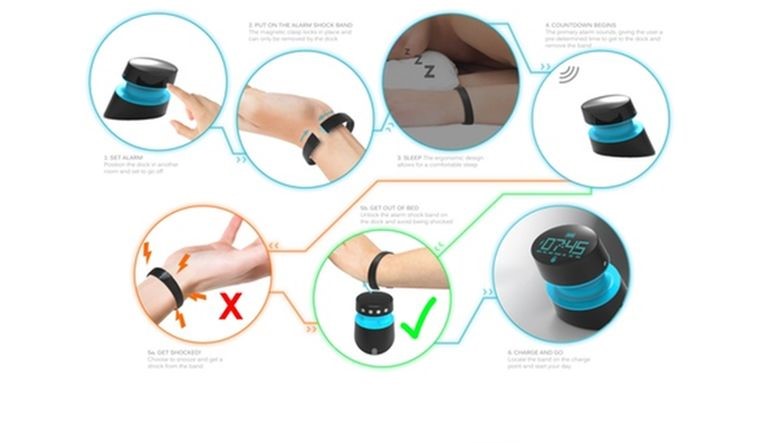 Το βραχιόλι Alarmshock φοριέται στον καρπό τη νύχτα πριν πέσετε για ύπνο και όταν το ξυπνητήρι σας σταματήσει το πρωί θα σας υπενθυμίσει πρώτα απαλά, ότι ήρθε η ώρα να σηκωθείτε από το κρεβάτι. Αν παραμείνετε ξαπλωμένοι ωστόσο το σύστημα αρχίζει να γίνεται λίγο πιο «σκληρό», κάνοντας ένα ηλεκτροσόκ χαμηλής έντασης που αυξάνεται σε ένταση όσο περνάει η ώρα.