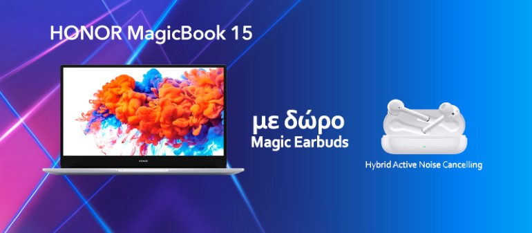 Από την Πέμπτη 7 Μαϊου 2020 είναι διαθέσιμο στην ελληνική αγορά το laptop της HONOR, το HONOR MagicBook 15 το οποίο διατίθεται σε super τιμή στα 599 ευρώ και όσοι το προπαραγγείλουν μέχρι τις 22 Μαϊου παίρνουν μαζί δώρο τα HONOR Magic Earbuds, τα νέα ασύρματα ακουστικά με Ηybrid Αctive Noise Cancelling αξίας 129 ευρώ.