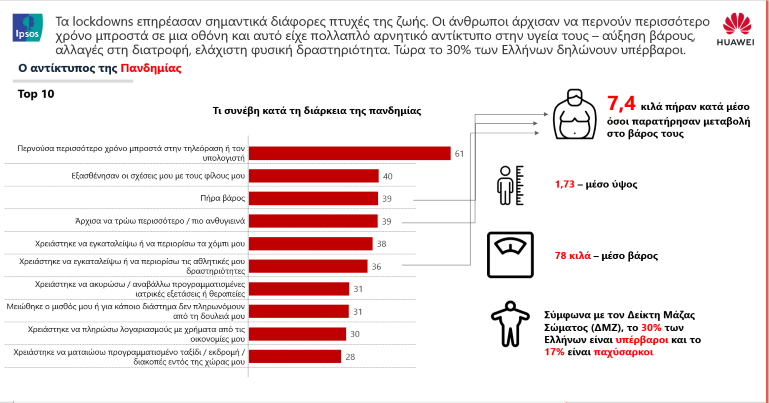 Νέα έρευνα της IPSOS, η οποία διεξήχθη σε 10 χώρες (Αυστρία, Βουλγαρία, Κροατία, Τσεχία, Ελλάδα, Ουγγαρία, Πολωνία, Ρουμανία, Σερβία και Τουρκία) με πρωτοβουλία της HUAWEI, αποκαλύπτει το πόσο μεγάλες αλλαγές έφερε η πανδημία τόσο στη φυσική κατάσταση όσο και στην ψυχική υγεία των πολιτών: αύξηση βάρους, κακή φυσική κατάσταση, άγχος, αϋπνία, πεσμένη διάθεση είναι λίγα μόνο από τα συμπτώματα που προκάλεσαν οι μήνες καθιστικής ζωής και περιορισμένης κοινωνικοποίησης.