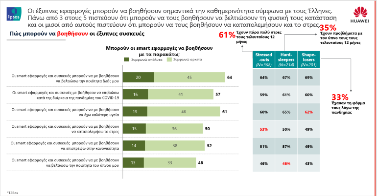 Βάσει των ευρημάτων της έρευνας, οι πολίτες αναγνωρίζουν τις επιπτώσεις που είχαν οι μήνες του lockdown στα σώματα και την ψυχολογία τους και βρίσκονται πλέον στο στάδιο να θέλουν να κάνουν κάτι για αυτό, από το να καταπιαστούν με μια νέα αθλητική δραστηριότητα ή να ξεκινήσουν ασκήσεις αναπνοής και διαλογισμού, μέχρι το να ταξιδέψουν εντός και εκτός Ελλάδας ή να κάνουν δίαιτα και να κλείσουν άμεσα ραντεβού για πλήρες ιατρικό check-up. Τι μπορεί να τους δώσει κίνητρο και την έξτρα ώθηση που χρειάζονται για να πάρουν τη ζωή στα χέρια τους; Οι έξυπνες συσκευές, όπως smartwatches και smartbands, οι οποίες διαθέτουν προηγμένη τεχνολογία και λειτουργίες ακριβείας για τη συνεχή παρακολούθηση της υγείας και της φυσικής κατάστασης των χρηστών.