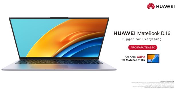 Το νέο HUAWEI MateBook D 16 είναι διαθέσιμο για προπαραγγελία με δώρο το HUAWEI MatePad T 10s σε όλο το επίσημο δίκτυο καταστημάτων των συνεργατών της εταιρείας, αλλά και στο Huaweistore.gr, ενώ η επίσημη διάθεσή του θα είναι στις 13 Ιουλίου.