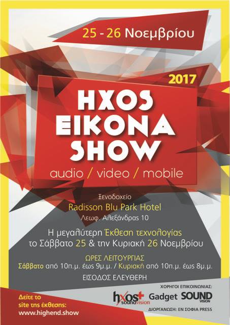 Από τo Σάββατο 25 έως και την Κυριακή 26 Νοεμβρίου λοιπόν, είτε είσαι μουσικόφιλος είτε όχι, θα βρεις τα πάντα για την τεχνολογία, τον ήχο και την εικόνα συγκεντρωμένα σε ένα μέρος: Στην hxoseikonashow 2017 στο ξενοδοχείο RadissonBluParkHotel. Θα υπάρξουν χρήσιμα δώρα με κληρώσεις, ενώ οι πρώτοι 100 επισκέπτες θα λάβουν ένα ειδικό δώρο ο καθένας.