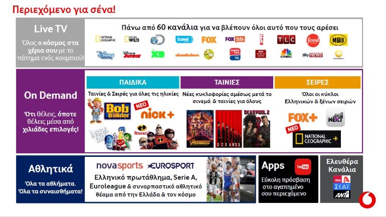 Στο νέο Vodafone TV οι συνδρομητές μπορούν να βρουν όλο το αγαπημένο τους περιεχόμενο σε μία πηγή, απολαμβάνοντας μία μοναδική εμπειρία χρήσης. Με πρόσβαση στον μεγαλύτερο on demand κατάλογο της αγοράς, κορυφαίο αθλητικό περιεχόμενο Novasports, 62 θεματικά κανάλια και συνεργασίες με τους μεγαλύτερους παραγωγούς και τα πιο δημοφιλή brands (National Geographic, Discovery, Ε! Εntertainment, Food Network, FOX, FOX life, Disney, Nickelodeon, κ.α.) το Vodafone TV συγκεντρώνει σε μία πλατφόρμα τις περισσότερες επιλογές περιεχομένου στην Ελλάδα. Επιπροσθέτως, στο πλαίσιο της συνεχούς αναβάθμισης του περιεχομένου, το VodafoneTV καλωσορίζει την ταινιοθήκη pameODEON, τις πρωτοποριακές on demand υπηρεσίες NAT GEO + και ΝICK +, και συνεχίζει την αποκλειστική διάθεση των Fox+ και Ant1 Next.