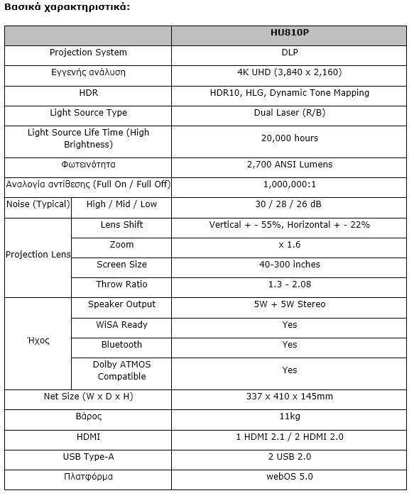 Η LG Electronics (LG) παρουσιάζει τον νέο προβολέα LG CineBeam 4K UHD Laser (μοντέλο HU810P), που έχει σχεδιαστεί για να προσφέρει μια αυθεντική κινηματογραφική εμπειρία στους καταναλωτές, έχοντας ταυτόχρονα την άνεση του σπιτιού τους. Ενσωματώνοντας την τελευταία καινοτομία της δημοφιλούς σειράς προβολέων υψηλής ανάλυσης της LG, ο συγκεκριμένος προβολέας διαθέτει χαρακτηριστικά και τεχνολογίες που το καθιστούν την ιδανική επιλογή για τους λάτρεις των ταινιών και για τις οικογένειες που απολαμβάνουν την οικιακή ψυχαγωγία. Εκτός από την υψηλή ποιότητα της κινηματογραφικής εικόνας, αυτό το μοντέλο δίνει τη δυνατότητα εύκολης πρόσβασης σε ταινίες που μόλις έχουν κυκλοφορήσει σε streaming πλατφόρμες, ενώ είναι συμβατός με δημοφιλείς εφαρμογές.