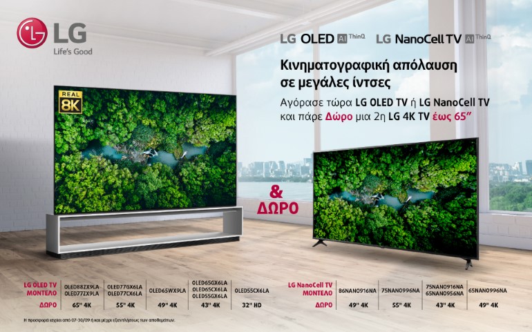 Η LG Electronics (LG) προσφέρει στους καταναλωτές κινηματογραφική απόλαυση σε μεγάλες ίντσες μέσα από τη νέα προωθητική της ενέργεια που συμπεριλαμβάνει OLED και NanoCell τηλεοράσεις. Συγκεκριμένα, από τις 7 έως και τις 30 Σεπτεμβρίου 2020 ή και μέχρι εξαντλήσεως των αποθεμάτων, με κάθε αγορά μιας OLED ή NanoCell τηλεόρασης, οι καταναλωτές παίρνουν δώρο μία επιπλέον LG τηλεόραση, entry μοντέλο 4K έως 65 ίντσες.