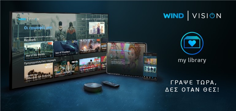 Η υπηρεσία παρέχεται εντελώς δωρεάν σε όλους τους συνδρομητές της WIND VISION και σε όλες τις συσκευές που διαθέτουν την εφαρμογή. Έτσι μπορούν να απολαύσουν το περιεχόμενο της επιλογής τους, προγραμματίζοντας την εγγραφή των προγραμμάτων που τους ενδιαφέρουν, χωρίς να χρειάζονται εξωτερικό σκληρό δίσκο ή άλλο μέσο αποθήκευσης, αφού όλα αποθηκεύονται αυτόματα στο “My Library” του μικρού αλλά πανίσχυρου αποκωδικοποιητή, που λειτουργεί ως Cloud. Οι συνδρομητές μπορούν να παρακολουθήσουν τις εγγραφές τους, οι οποίες γίνονται άμεσα διαθέσιμες, στον αποκωδικοποιητή και σε τέσσερις φορητές συσκευές, για μεμονωμένη ή ταυτόχρονη θέαση από τις διαφορετικές συσκευές που χρησιμοποιούν τα υπόλοιπα μέλη μιας οικογένειας. Στην περίπτωση δε της «εγγραφής σειράς», η νέα υπηρεσία εγγραφής της WIND VISION φροντίζει για την αυτοματοποιημένη εγγραφή όλων των επεισοδίων με την εύχρηστη τακτοποίησή τους ανά σειρά και κύκλο επεισοδίων.