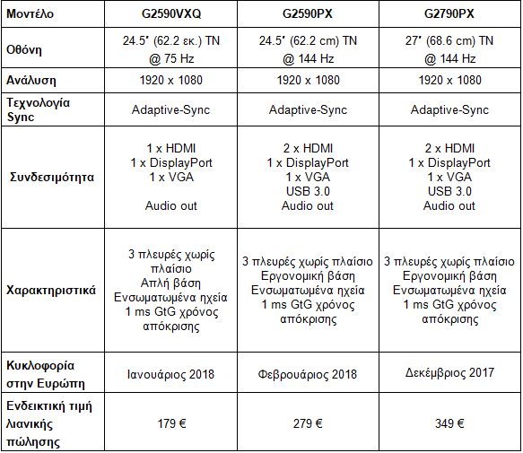 Και τα τρία μοντέλα είναι εξοπλισμένα με 16:9 Full HD (1920 x 1080) TN πάνελ χωρίς πλαίσιο, FreeSync υποστήριξη, πολύ χαμηλό χρόνο απόκρισης 1 ms και υψηλούς χρόνους ανανέωσης (144 Hz για τα G2590PX και G2790PX, και 75 Hz για το G2590VXQ), που εξασφαλίζουν μία ομαλή εμπειρία gaming χωρίς θαμπάδα, σκίσιμο της εικόνας ή τρεμόπαιγμα.