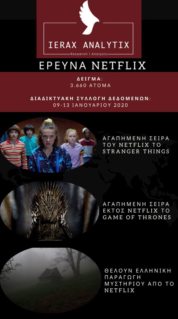 Νέα έρευνα διεξήχθη για τις συνήθειες του ελληνικού κοινού που παρακολουθεί σειρές στο Netflix. Η έρευνα έγινε από την εταιρεία αναλύσεων ierax analytix και τα αποτελέσματα έρχονται να συμφωνήσουν με αυτά των συνηθειών της υπόλοιπης Ευρώπης σε μεγάλο ποσοστό.
