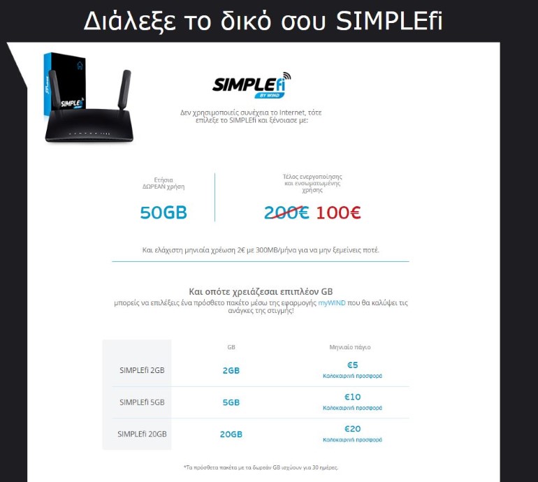 Τον πιο απλό τρόπο για γρήγορο Internet στο σπίτι ή στο εξοχικό, προσφέρει η WIND, χάρη στη νέα, ευέλικτη λύση SIMPLEfi. Με την υπηρεσία SIMPLEfi, οι πελάτες εξασφαλίζουν γρήγορο και σταθερό Internet στο σπίτι ή το εξοχικό τους, πιο εύκολα από ποτέ.