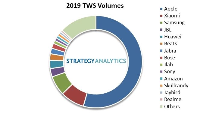 Η εταιρεία αναλύσεων Strategy Analytics αποκάλυψε ότι η Apple είναι μακράν ο νο.1 παίκτης της συγκεκριμένης κατηγορίας, καθώς κατάφερε να πουλήσει 58,7 εκατ. AirPods μέσα στο 2019, αποκτώντας έτσι μερίδιο που φτάνει το 54,4%. Με λίγα λόγια, ένα στα δύο ζευγάρια ακουστικών True Wireless που πωλήθηκαν το 2019 ήταν της Apple. Η υψηλή τιμή των ακουστικών της Apple της έδωσε το 71% σε μερίδιο όσον αφορά τα κέρδη από αυτήν την κατηγορία.