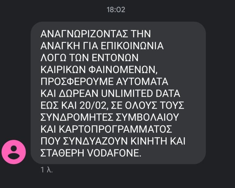 «Αναγνωρίζοντας την ανάγκη για επικοινωνία λόγω των έντονων καιρικών φαινομένων, προσφέρουμε αυτόματα και δωρεάν unlimited data έως και 20/02, σε όλους τους συνδρομητές συμβολαίου και καρτοπρογράμματος που συνδυάζουν κινητή και σταθερή Vodafone.»