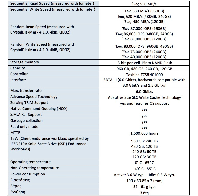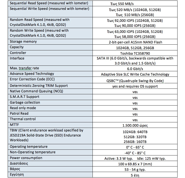 Η Toshiba, όντας εδώ και πολλά χρόνια μια από τις μεγαλύτερες εταιρείες στον τομέα των αποθηκευτικών μέσων, παρουσίασε τα νέα, εσωτερικά Solid State Drives σε διάσταση 2.5 ιντσών / 7 χιλιοστών, με ενισχυμένη, υψηλών επιδόσεων τεχνολογία 15nm flash memory για τα εσωτερικά τσιπ. Εκτός από ενίσχυση επιδόσεων και μείωση κατανάλωσης ενέργειας, η εξέλιξη από 19nm σε 15nm flash στην κλίμακα κατασκευής, συνεπάγεται αύξηση της χωρητικότητας στη σειρά Toshiba SSD Q300 Pro στα 1024 GB.
