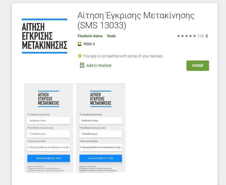Πρόκειται για μια εφαρμογή για κινητά και tablets με το όνομα «Αίτηση Έγκρισης Μετακίνησης (SMS 13033)» που βρίσκεται στο Google Play και με την οποία ο χρήστης μπορεί να εξυπηρετείται γρηγορότερα κάθε φορά που επιθυμεί να μετακινείται από το σπίτι του. Μπορείτε να τη βρείτε, πατώντας εδώ.