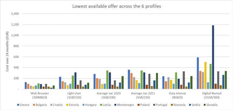 Στο παρακάτω διάγραμμα παρουσιάζονται οι τιμές που θα πλήρωνε ένας χρήστης για την καλύτερη προσφορά ανά προφίλ για 24 μήνες σε κάθε χώρα.