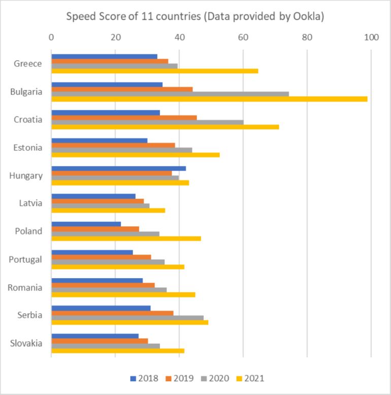 Σχετικά με την ποιότητα της υπηρεσίας (ταχύτητα, καθυστέρηση) η Tarifica αναφέρεται σε σύγκριση με βάση το δείκτη Speed Score4 της εταιρείας Ookla των δικτύων κινητών επικοινωνιών στις χώρες τις οποίες συμπεριλαμβάνει στην ανάλυση της (εκτός από το Μαυροβούνιο). Στη σύγκριση αυτή η Ελλάδα κατατάσσεται τρίτη καλύτερη για το 2021 όπως φαίνεται στο παρακάτω διάγραμμα.