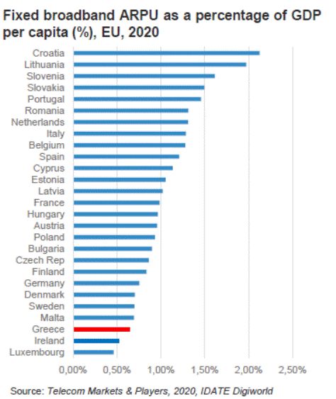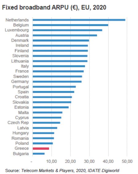Η Ελλάδα έχει το δεύτερο χαμηλότερο μέσο έσοδο ανά χρήστη (ARPU) για σταθερές ευρυζωνικές υπηρεσίες (8.68 ευρώ) μεταξύ των 27 χωρών της Ευρωπαϊκής Ένωσης όπως φαίνεται στο παρακάτω διάγραμμα. Συγκεκριμένα η Ελλάδα είναι ακριβότερη μόνο από τη Ρουμανία (μέσο έσοδο ανά χρήστη 6.39 ευρώ) και η μία από τις δύο μόνο χώρες (μαζί με τη Ρουμανία) με μέσο έσοδο ανα χρήστη μικρότερο από 10 ευρώ μεταξύ των 27 χωρών της Ευρωπαϊκής Ένωσης.