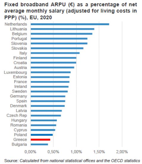 Το μέσο μηνιαίο έσοδο ανά χρήστη σαν ποσοστό του καθαρού μέσου μηνιαίου μισθού (προσαρμοσμένου ως προς τα κόστη διαβίωσης σε όρους ισοτιμίας αγοραστικής δύναμης) για την Ελλάδα για το 2020 ήταν 0.48%. Η Ελλάδα έχει το δεύτερο χαμηλότερο μέσο έσοδο ανά χρήστη σαν ποσοστό του μέσου καθαρού μηνιαίου μισθού (προσαρμοσμένου ως προς τα κόστη διαβίωσης σε όρους ισοτιμίας αγοραστικής δύναμης) μεταξύ 26 χωρών της Ευρωπαϊκής Ένωσης (εκτός της Μάλτας) πίσω μόνο από τη Βουλγαρία (0.38%). Η Ολλανδία, η Λιθουανία και το Βέλγιο έχουν τα υψηλότερα μέσα έσοδα ανά χρήστη ως ποσοστό του μέσου καθαρού μηνιαίου μισθού (1.72%, 1.39%, 1.35% αντίστοιχα). Τα αποτελέσματα της σύγκρισης με βάση το μέσο έσοδο ανά χρήστη ως ποσοστό του καθαρού μέσου μηνιαίου μισθού παρουσιάζονται στο παρακάτω διάγραμμα.