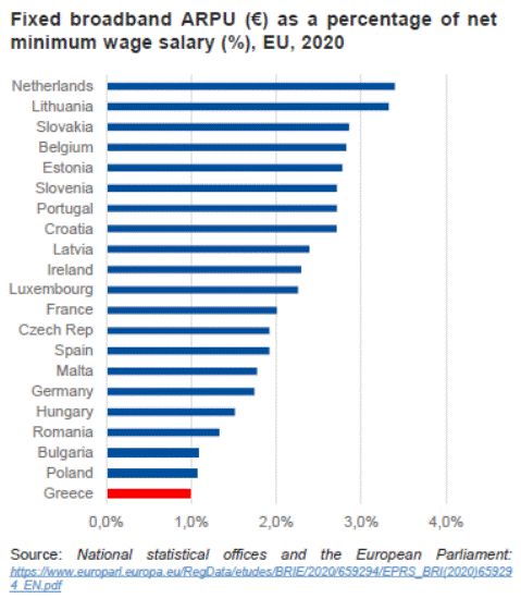 Το μέσο μηνιαίο έσοδο ανά χρήστη σαν ποσοστό του κατώτατου μισθού για την Ελλάδα για το 2020 ήταν 1% με κατώτατο μισθό 876 ευρώ. Η Ελλάδα έχει το χαμηλότερο/φθηνότερο μέσο έσοδο ανά χρήστη σαν ποσοστό του κατώτατου μισθού μεταξύ 21 χωρών της Ευρωπαϊκής Ένωσης. Την ακολουθούν η Πολωνία και η Βουλγαρία με 1.1%. Οι τρεις ακριβότερες χώρες μεταξύ των 21 της Ευρωπαϊκής Ένωσης που συμπεριλαμβάνονται στη σύγκριση είναι η Ολλανδία με 3.4% (κατώτατος μισθός 1443 ευρώ), η Λιθουανία με 3.3% (κατώτατος μισθός 873 ευρώ) και η Σλοβακία με 2.9% (κατώτατος μισθός 715 ευρώ). Τα αποτελέσματα της σύγκρισης με βάση το μέσο έσοδο ανά χρήστη σαν ποσοστό του καθαρού μέσου μηνιαίου μισθού παρουσιάζονται στο παρακάτω διάγραμμα.