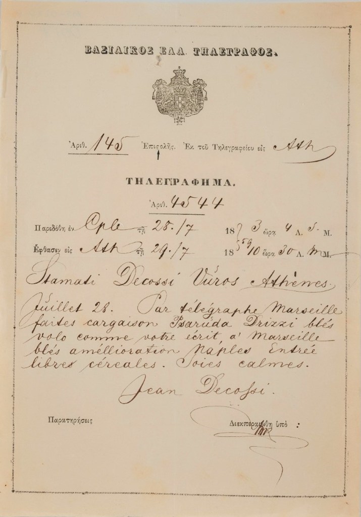 - 3.700 τηλεγραφήματα. Καλύπτουν τη χρονική περίοδο 1860-1980 και ο κύριος όγκος αποκτήθηκε μέσω δωρεών και αγορών. Το περιεχόμενό τους εκτείνεται από την σφαίρα του ιδιωτικού και οικονομικού βίου έως την πολιτική και στρατιωτική ιστορία της Ελλάδας.