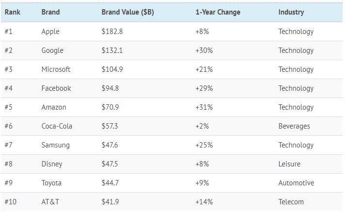 H Apple παραμένει το brand με τη μεγαλύτερη αξία, φτάνοντας φέτος τα 182,8 δισ. δολάρια, με τις υπόλοιπες 4 τεχνολογικές brands της πεντάδας να αυξάνουν σημαντικά την αξία τους επίσης: Google (+30%), Microsoft (+21%), Facebook (+29%) και Amazon (31%).
