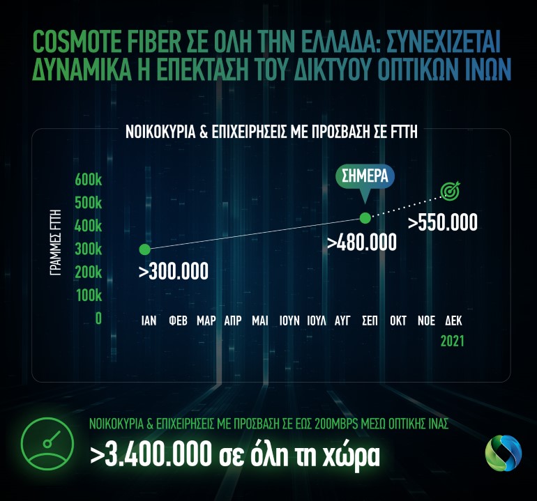 Πρόσβαση στις υπερ-υψηλές ταχύτητες και τις απεριόριστες δυνατότητες της οπτικής ίνας μέχρι το σπίτι (FTTH), έχουν πλέον 480.000 νοικοκυριά και επιχειρήσεις σε όλη την Ελλάδα μέσω του COSMOTE Fiber[1], του μεγαλύτερου δικτύου οπτικών ινών στη χώρα. Συνεχίζοντας την υλοποίηση του μεγαλύτερου έργου αναβάθμισης τηλεπικοινωνιακών υποδομών των τελευταίων δεκαετιών, στο πλαίσιο του οποίου τοποθετεί οπτικές ίνες σε όλη τη χώρα, η COSMOTE «ενεργοποίησε» το FTTH σε 10 νέες περιοχές και συνέχισε να επεκτείνει τη διαθεσιμότητα σε περιοχές που ήδη έχουν πρόσβαση σε FTTH. Συνολικά, το COSMOTE Fiber προσφέρει σήμερα πρόσβαση σε υπερ-υψηλές ταχύτητες έως 200Mbps σε περισσότερα από 3,4 εκατομμύρια νοικοκυριά κι επιχειρήσεις πανελλαδικά.