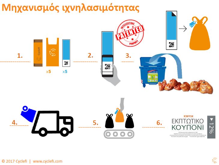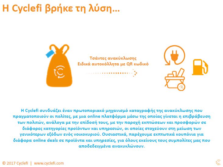 Ουσιαστικά, η Cyclefi, προτείνει μια λύση, με μεγαλύτερο αντίκτυπο, που δεσμεύει τους πολίτες, επιφέρει αύξηση της ανακύκλωσης, καλύτερης ποιότητας υλικά προς ανάκτηση και μείζονα θετική αλλαγή συμπεριφοράς.Για να το πετύχει αυτό, έχουν δημιουργήσει μια καινοτόμο προϊοντική υπηρεσία, η οποία ουσιαστικά βασίζεται στην χρήση μιας “έξυπνης” τσάντας, πιο συγκεκριμένα της πρώτης σακούλας απορριμμάτων με ταυτότητα, η οποία απορρίπτεται αποκλειστικά στο Μπλε κάδο, άρα αποτελεί τη πρώτη τσάντα ανακύκλωσης. Η εισαγωγή στην ελληνική αγορά της πρώτης “έξυπνης” τσάντας απορριμμάτων αποτελεί έτσι και αλλιώς μια πρωτοποριακή είδηση. Η συγκεκριμένη τσάντα, ακριβώς επειδή είναι “έξυπνη”, μπορεί να γνωρίζει πόσο συχνά ανακυκλώνουν οι χρήστες της και ανάλογα με την επίδοσή τους να τους παρέχει εκπτωτικά κουπόνια.