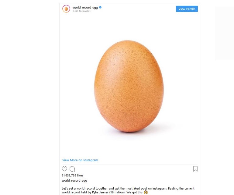Κάπως έτσι, η συγκεκριμένη είδηση έχει να κάνει με ένα αυγό. Ένα αυγό που για κάποιον ανεξήγητο λόγο έγινε πολύ διάσημο στο Instagram. Για την ακρίβεια, μέσα σε μία εβδομάδα, η παρακάτω φωτογραφία ενός απλού αυγού έφτασε τα 21 εκατ. likes και έγινε η πιο δημοφιλής στο Instagram, αρπάζοντας τον τίτλο από τη φωτογραφία της Kylie Jenner με το μωρό της, η οποία βρίσκεται πλέον στη 2η θέση.