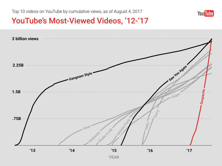Η Λάτιν Μουσική έχει αναπτυχθεί εκρηκτικά παγκοσμίως στο YouTube, με τις λάτιν καλλιτεχνικές συμμετοχές να αντιπροσωπεύουν πάνω από το ένα τρίτο των 100 καλύτερων καλλιτεχνών του YouTube το 2017 μέχρι σήμερα. Αυτό περιλαμβάνει καλλιτέχνες όπως ο Nicky Jam, ο Maluma, ο J Balvin και ο Ozuna, που όλοι έχουν ξεπεράσει το ορόσημοτων 1 δισεκατομμυρίων προβολών φέτος.