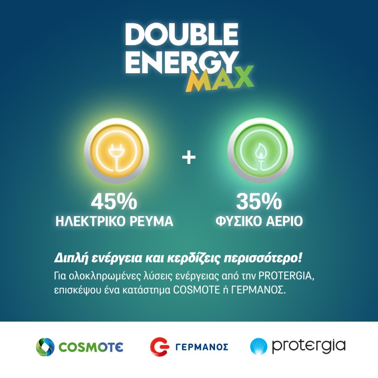 45% έκπτωση στους λογαριασμούς ηλεκτρικής ενέργειας και 35% στους λογαριασμούς φυσικού αερίου, προσφέρει, για 2 ολόκληρα χρόνια, η Protergia στους πελάτες που θα τα συνδυάσουν και είναι συνεπείς στην εξόφληση των λογαριασμών τους , μέσα από το Protergia Double Energy MAX, που διατίθεται στα καταστήματα COSMOTE και ΓΕΡΜΑΝΟΣ.