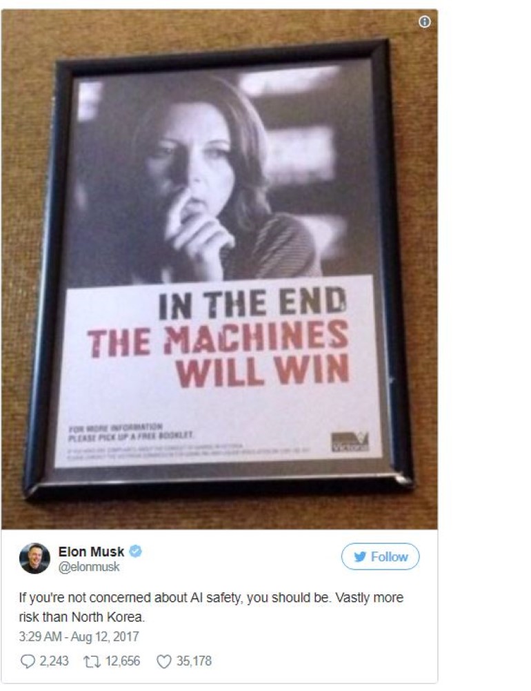 Ενώ λοιπόν η ένταση κορυφώνεται, ειδικά μετά από τέτοιες δηλώσεις, εκατέρωθεν, ο Musk βλέπει παραπέρα και μιλά για την “εξέγερση των μηχανών”. Μέσα από το Twitter ο ίδιος λέει πως όσοι δεν ανησυχούν για την ασφάλεια της τεχνητής νοημοσύνης, θα έπρεπε να το κάνουν: “Πολύ μεγαλύτερος κίνδυνος από τη Βόρεια Κορέα”, λέει χαρακτηριστικά.