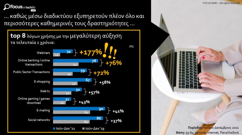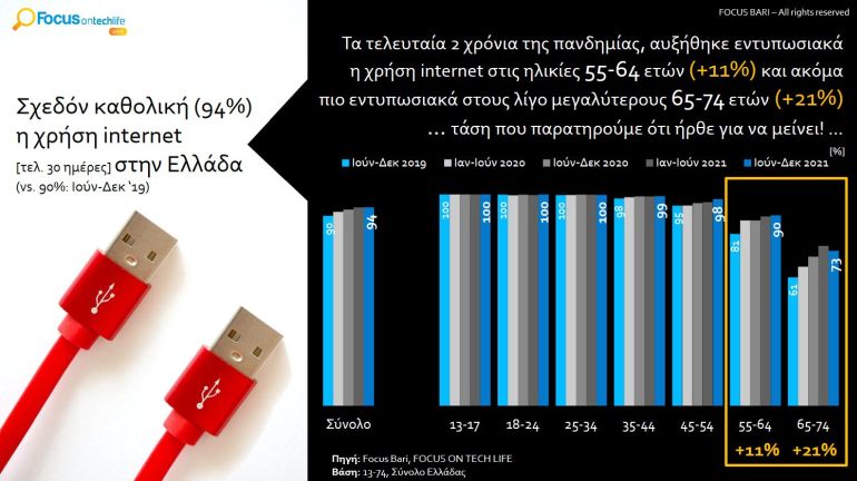 Έρευνα της Focus Bari δείχνει ότι πλέον σχεδόν όλοι οι Έλληνες είναι Ψηφιακοί Πολίτες. Καθώς η χρήση internet έχει πλέον φτάσει στο 94% του ελληνικού πληθυσμού, οι πιο πρόσφατοι «ψηφιακοί πολίτες» είναι οι πιο ώριμοι Έλληνες ενήλικες, που ανήκουν στις ηλικιακές ομάδες των 55+. Ειδικά με τις συνθήκες της πανδημίας, ακόμα και οι παππούδες και οι γιαγιάδες προσήλθαν στον κόσμο του digital με πλειάδα εφαρμογών και χρήσεων!