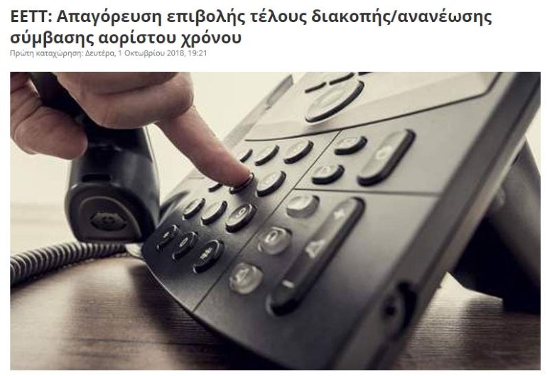 Διευκρινίζεται ότι η υποχρέωση των παρόχων να μην επιβάλουν τέλος αποσύνδεσης λόγω διακοπής / καταγγελίας σύμβασης (σταθερής ή κινητής τηλεφωνίας) δεν αφορά σε συμβάσεις ορισμένου χρόνου, αλλά μόνο συμβάσεις αορίστου χρόνου και συνδέσεις καρτοκινητής τηλεφωνίας, όπως αναφέρεται και στο σχετικό δελτίο τύπου της ΕΕΤΤ (01/10/18): «Απαγόρευση επιβολής τέλους διακοπής/ανανέωσης σύμβασης: Ο πάροχος δεν επιτρέπεται να επιβάλει τέλος αποσύνδεσης λόγω διακοπής/καταγγελίας είτε σύμβασης αορίστου χρόνου είτε σύνδεσης καρτοκινητής τηλεφωνίας.»