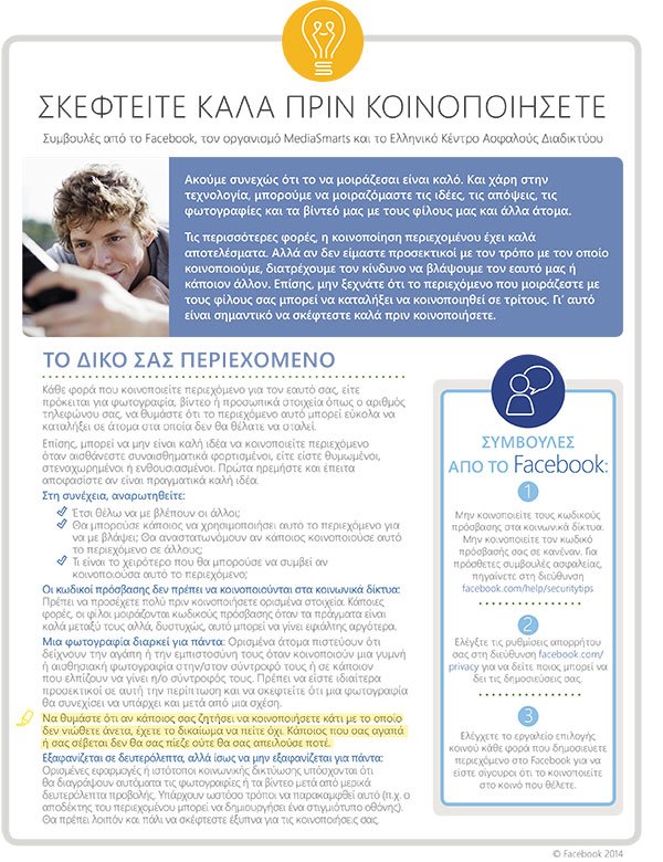 Σύμφωνα με την έρευνα της MediaSmarts και σε συνεργασία με το Ελληνικό Κέντρο Ασφαλούς Διαδικτύου το Facebook δημιούργησε το φύλλο συμβουλών «Σκεφτείτε Καλά Πριν Κοινοποιήσετε» που περιλαμβάνει μερικές βασικές συμβουλές για το πώς να προσαρμόσουμε τις ρυθμίσεις απορρήτου, έτσι ώστε οι έφηβοι να μπορούν να ελέγχουν πλήρως τις κοινοποιήσεις τους και να είναι βέβαιοι ότι τους περιεχόμενο τους μπορεί να εμφανίζεται μόνο σε τους ανθρώπους της επιλογής τους.