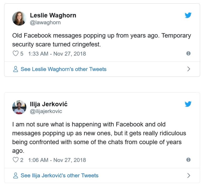 Χρήστες του Facebook αναφέρουν από εχθές μια πολύ περίεργη περίπτωση: Λάθη της πλατφόρμας προκαλούν παλιές συζητήσεις του Messenger να επανεμφανιστούν τυχαία και χωρίς λόγο ή κάποια εξήγηση. Τα πρώτα περιστατικά αναφέρθηκαν από χρήστες του Twitter και πλέον η εταιρεία ανακοίνωσε ότι αναγνωρίζει το πρόβλημα, καθώς παλιά μηνύματα φέρονται ως νέα, αδιάβαστα.