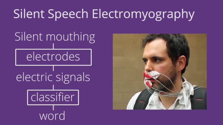 Βέβαια, αν κοιτάξεις καλύτερα ολόγυρα, μάλλον θα ανακαλύψεις αυτόν που «ψιθυρίζει», επειδή τον προδίδει η συσκευή: ένα ηχείο στερεωμένο στο μέτωπό ή στο στήθος του και τέσσερα ηλεκτρόδια γύρω από το στόμα και το σαγόνι του.