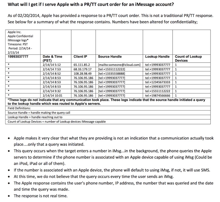 Μετά την διαρροή του εγγράφου και τον αναμενόμενο προβληματισμό που δημιουργήθηκε, η Apple προέβη σε μια δήλωσε, κατά την οποία αναγνωρίζει την υποχρέωσή της να συμμορφώνεται και να υπακούει σε έγκυρες δικαστικές εντολές όπως ορίζει ο νόμος, εντούτοις δήλωσε ρητά πως το περιεχόμενο των μηνυμάτων είναι απόρρητο, καθώς ούτε η ίδια έχει πρόσβαση σε αυτό (σσ. λόγω της κρυπτογράφησης). Εν κατακλείδι λοιπόν, τίποτε στην ψηφιακή και άκρως διαδικτυακή σύγχρονη πραγματικότητα δεν είναι απόλυτα ιδιωτικό, έστω κι αν προσφέρεται αυτή η ψευδαίσθηση. Άλλωστε εδώ και πολλές δεκαετίες, οι εταιρείες σταθερής και κινητής τηλεφωνίας, όταν υποχρεωθούν νόμιμα, παραδίδουν τις συνδιαλέξεις μας στις αρχές…