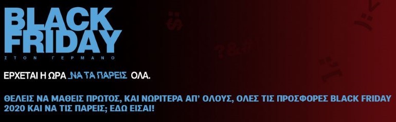Όσοι ενδιαφέρονται να μάθουν πρώτοι τις προσφορές, μπορούν να εγγραφούν στο newsletter του ΓΕΡΜΑΝΟΥ, για να προλάβουν τα προϊόντα που θέλουν. Πληροφορίες στο https://www.germanos.gr/black-friday/