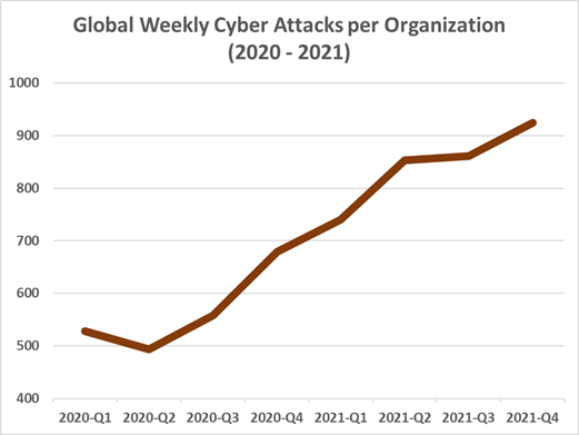 Η Check Point Research (CPR), το τμήμα έρευνας της Check Point Software αναφέρει πως η τάση αύξησης των κυβερνοεπιθέσεων έφτασε στο υψηλότερο σημείο όλων των εποχών στα τέλη του 2021 μετά την αποκάλυψη της ευπάθειας Log4J, φτάνοντας τις 925 κυβερνοεπιθέσεις την εβδομάδα ανά οργανισμό, σε παγκόσμιο επίπεδο.