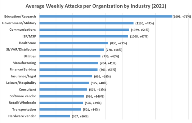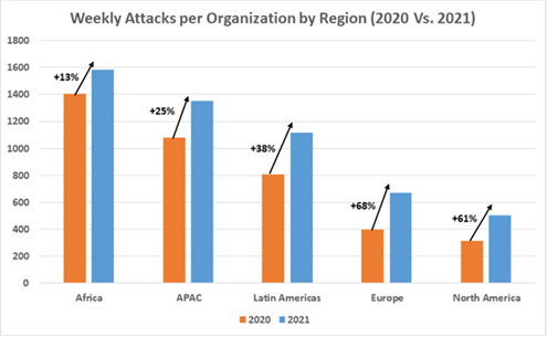 Με την αρχή του νέου έτους, η Check Point Research (CPR) παρουσιάζει παγκόσμια στατιστικά στοιχεία για την αύξηση των επιθέσεων στον κυβερνοχώρο όπως παρατηρήθηκαν το 2021 ανά περιοχή, χώρα και κλάδο. Πέρυσι, η CPR παρατήρησε αύξηση 50% στις κυβερνοεπιθέσεις ανά εβδομάδα σε εταιρικά δίκτυα σε σύγκριση με το 2020, με αποκορύφωμα τον Δεκέμβριο, κυρίως λόγω των εκμεταλλεύσεων του Log4J. Οι χάκερς στόχευσαν περισσότερο την Αφρική, την Ασία και τη Λατινική Αμερική, αλλά η Ευρώπη είδε τη μεγαλύτερη ποσοστιαία αύξηση των κυβερνοεπιθέσεων σε σχέση με το προηγούμενο έτος. Ο τομέας της εκπαίδευσης/έρευνας ήταν αυτός που κατέλαβε την πρώτη θέση ως ο πιο στοχευμένος κλάδος παγκοσμίως.