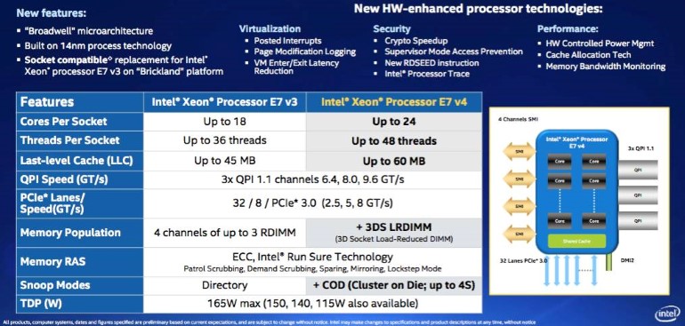 Η Intel ανέφερε ότι η σειρά E7 v4 θα έχει ταχύτερες επιδόσεις κατά 40% σε σχέση με τη σειρά Power8 της IBM. Παράλληλα ενημέρωσαν ότι οι νέοι επεξεργαστές εκτός από επιδόσεις, θα προσφέρουν και ασφάλεια με καλύτερη κωδικοποίηση σε πολύ μεγαλύτερη ταχύτητα.
