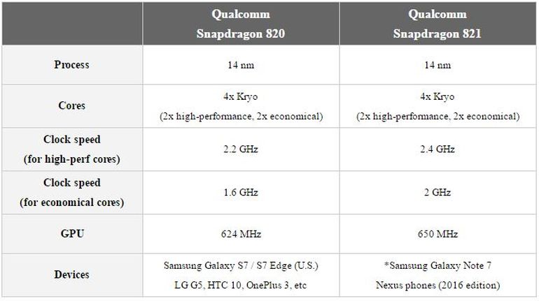 Ο Snapdragon 821 παραμένει 4-πύρηνος, αλλά είναι κάτα 10% πιο γρήγορος, καθώς η Qualcomm κατάφερε και τον χρόνισε πιο ψηλά. Όπως και ο 820, ο 821 έχει δύο Kryo CPU πυρήνες, που τρέχουν σε υψηλότερη ταχύτητα, όποτε είναι αναγκαίο, αλλά και δύο “οικονομικούς” Kryo πυρήνες, που τρέχουν σε λιγότερα Hz. Η ταχύτητα των high-performance στον 820 ήταν 2.2GHz, ενώ στον 821 φτάνει τα 2.4GHz. Οι economical από 1.6GHz είναι στα 2GHz. Επιπρόσθετα, το τσιπ των γραφικών είναι ταχύτερο και αυτό από τα 624MHz του 820 στα 650Mhz στον 821.